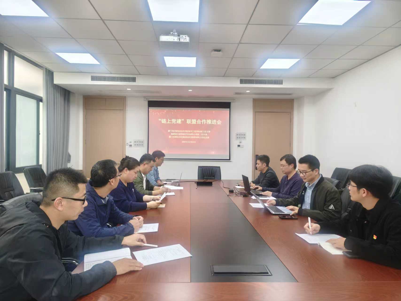 海洋工程学院教工党支部书记江田辉围绕学院在海洋工程领域的人才培养、科研创新及技术服务方面的优势,阐述高校在产业链中作为“创新源”与“人才库”的定位,并就技术研发、成果转化全链条合作提出具体意向。福建卫星数据开发有限公司第二党支部介绍其在海洋遥感监测、数据信息服务等上游环节的数据支撑能力;厦门市翔安市政集团泊车管理有限公司党支部从智慧市政与海洋管理结合的实际应用场景出发,展示下游落地运营及管理服务的实际需求。三方围绕“数据—技术—应用”的海洋产业链条,就共建产学研平台、推动数据共享与技术协同、开展人才定向培养等议题深入交流。